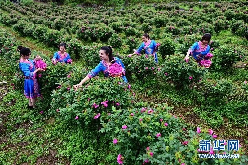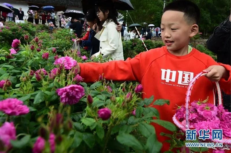 游客在五龙坪村玫瑰花种植基地体验玫瑰花采摘乐趣