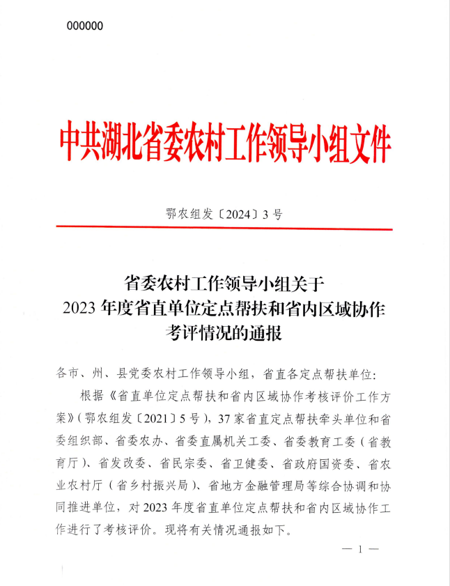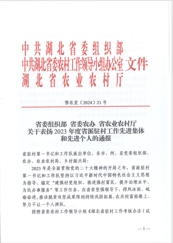 同时,省农业农村厅印发的省委组织部、省委农办、省农业农村厅《关于表扬2023年度省派驻村工作先进集体和先进个人的通报》(鄂农发[2024]21号),开云app登录入口荣获“2023年度工作突出派出单位”。
